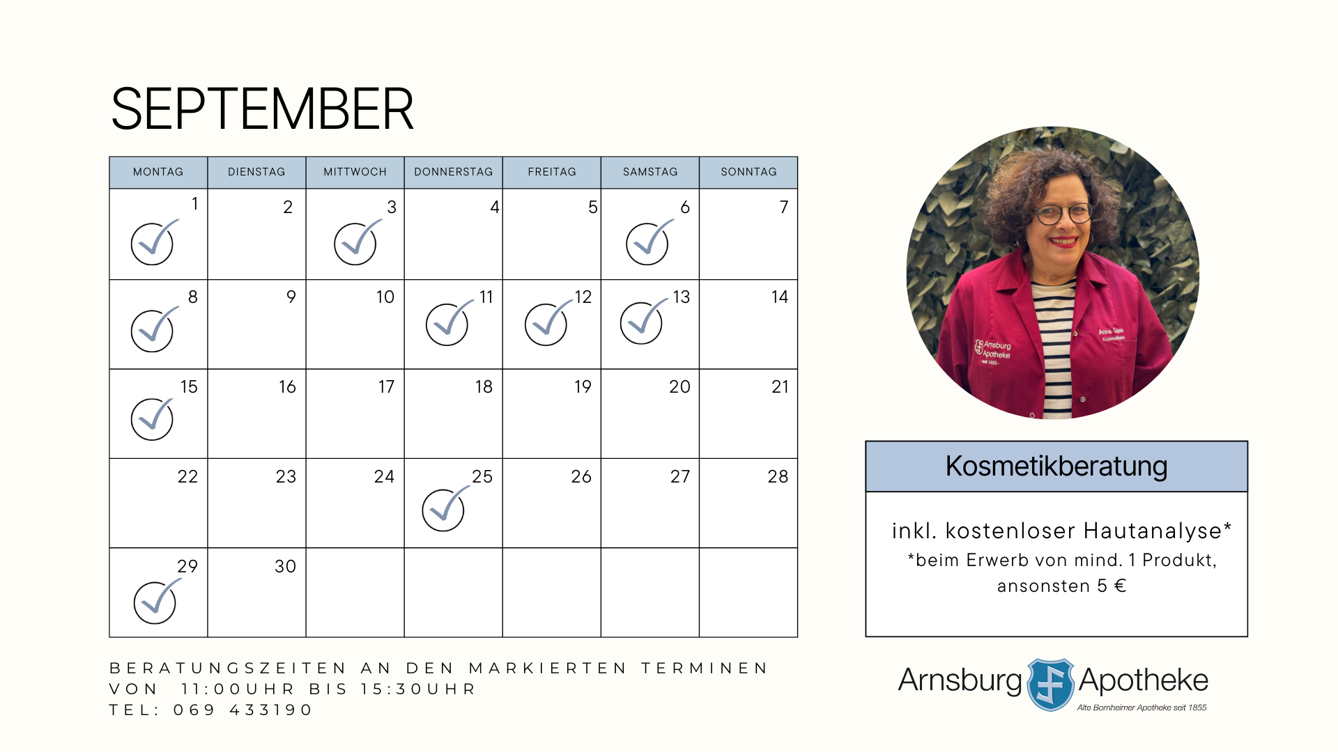 Wir beraten Sie gerne zu Neurodermitis, Akne, Couperose, feuchtigkeitsarmer Haut oder klassischer Anti-Aging Pflege. Auf Wunsch führen wir eine Hautanalyse durch. Mit unserem Hautanalysegerät messen wir Ihre Melanin-, Feuchtigkeits- und Fettwerte. Dadurch können wir Ihre perfekten Pflegeprodukte aus unserem großen Sortiment hochwertiger und apothekenexklusiver Kosmetik finden.
